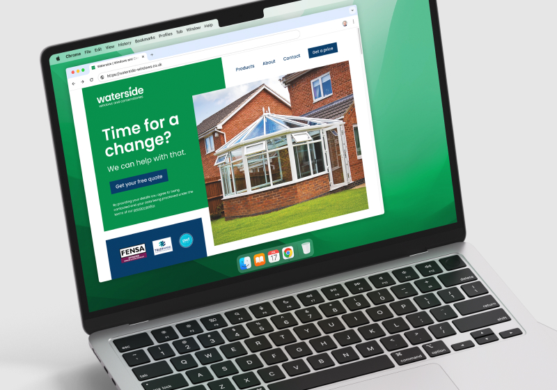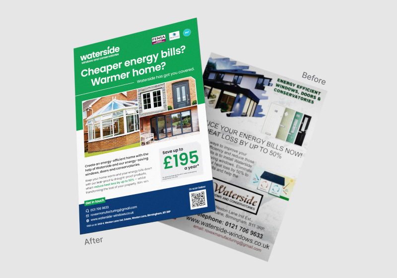 A fresh brand identity for double glazing company Waterside — imbued with personality and warmth through price-friendly messaging, a personable tone of voice and an upbeat colour palette.