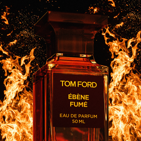 A fully modelled, texturised, and animated 3D scene featuring Tom Ford’s Ébène Fumé fragrance. The scene’s composition evokes the DNA of the popular scent: a woody, fiery, resinous, and alluring experience.