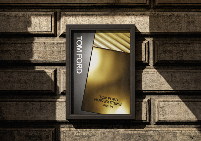 A fully modelled and texturised 3D scene featuring Noir Extreme Parfum by Tom Ford. The scene’s composition evokes the characteristics of the fragrance, which is an opulent, warm and daring scent best suited for evening wear.